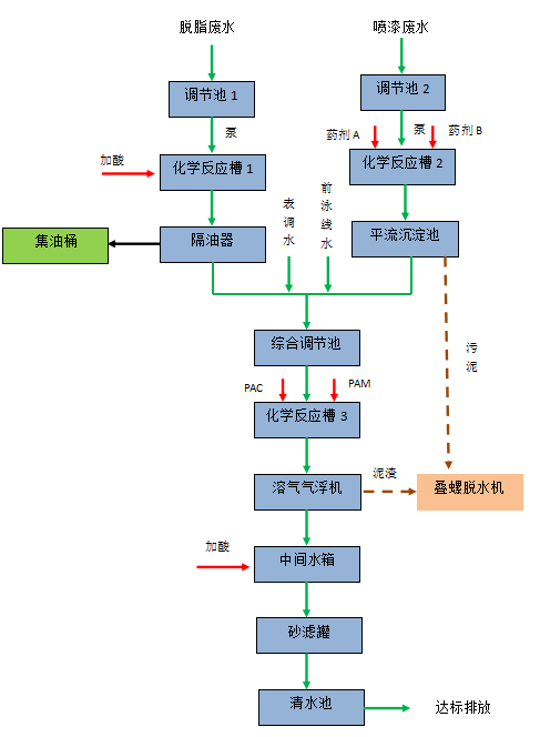 噴涂工藝在金屬表面處理中運用極其廣泛,在生產過程中基本上都有噴涂廢水產生,噴涂廢水中呈酸性且含有多種金屬離子和非金屬離子,其中有些為一類毒物,必須經處理后達標后排放。噴涂廢水污染物種類較多,水質、水量波動較大,工程、工藝設計時需對源頭水進行分流,并對高濃度廢液進行分質預處理,以提高后續處理工藝的穩定性,進而確保噴涂廢水處理穩定達標排放。